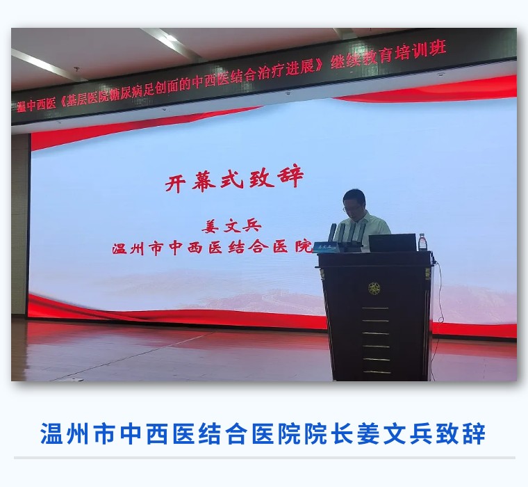 2024年7月21日,溫州市繼續(xù)醫(yī)學(xué)教育項目《基層醫(yī)院糖尿病足創(chuàng)面的中西醫(yī)結(jié)合治療進(jìn)展》學(xué)習(xí)班在溫州市中西醫(yī)結(jié)合醫(yī)院順利召開。溫州市中西醫(yī)結(jié)合醫(yī)院院長姜文兵出席開班典禮并致辭。