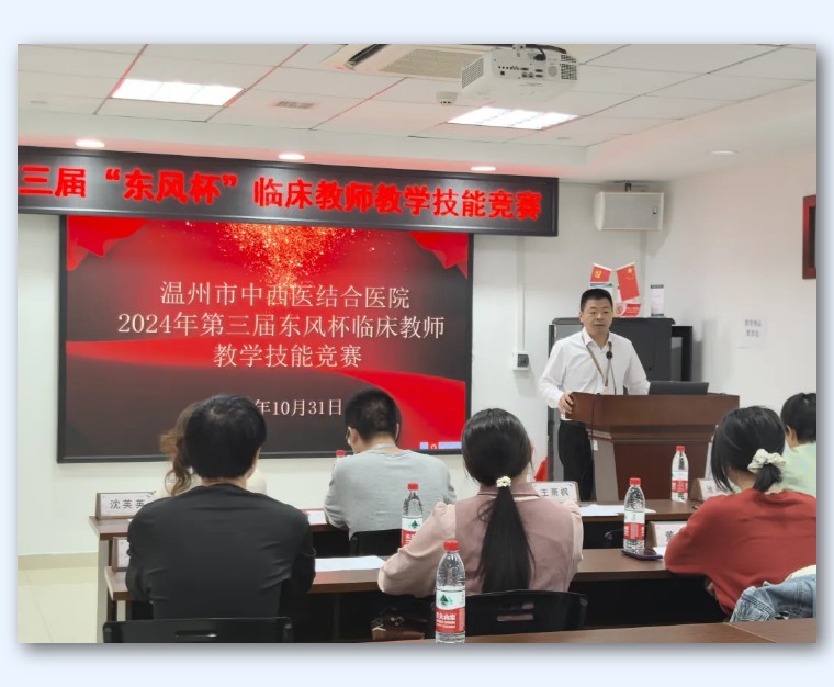 2024年10月31日,溫州市中西醫(yī)結(jié)合醫(yī)院成功舉辦了第三屆“東風(fēng)杯”臨床教師教學(xué)技能競(jìng)賽。此次競(jìng)賽旨在提高醫(yī)院教學(xué)團(tuán)隊(duì)的專業(yè)素養(yǎng),點(diǎn)燃教師的教學(xué)激情,并推動(dòng)醫(yī)學(xué)教育與臨床實(shí)踐的深度融合,從而為患者提供更加卓越的醫(yī)療服務(wù),助力教學(xué)醫(yī)院的高質(zhì)量發(fā)展。
